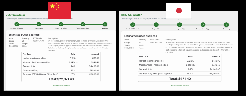 ✔ Run tariff simulations – Before exploring new suppliers, Importal’s Duty Calculator helps brands analyze duty and tax savings across global sourcing options, ensuring they retain every possible dollar. For example, importing golf clubs from Japan instead of China would reduce duties by 21.9%.